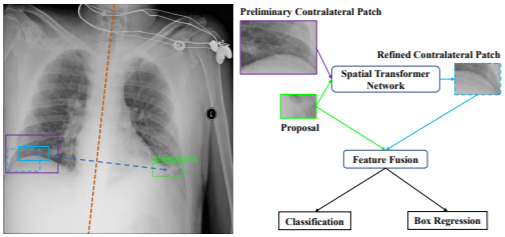 Identifying and locating diseases in chest Xrays are very challenging, due to the low visual contrast between normal and abnormal regions, and distortions caused by other overlapping tissues. An interesting phenomenon is that there exist many similar structures in the left and right parts of the chest, such as ribs, lung fields and bronchial tubes. This kind of similarities can be used to identify diseases in chest X-rays, according to the experience of broad-certificated radiologists. Aimed at improving the performance of existing detection methods, we propose a deep end-to-end module to exploit the contralateral context information for enhancing feature representations of disease proposals. First of all, under the guidance of the spine line, the spatial transformer network is employed to extract local contralateral patches, which can provide valuable context information for disease proposals. Then, we build up a specific module, based on both additive and subtractive operations, to fuse the features of the disease proposal and the contralateral patch. Our method can be integrated into both fully and weakly supervised disease detection frameworks. It achieves 33.17 AP50 on a carefully annotated private chest X-ray dataset which contains 31,000 images. Experiments on the NIH chest Xray dataset indicate that our method achieves state-of-theart performance in weakly-supervised disease localization.